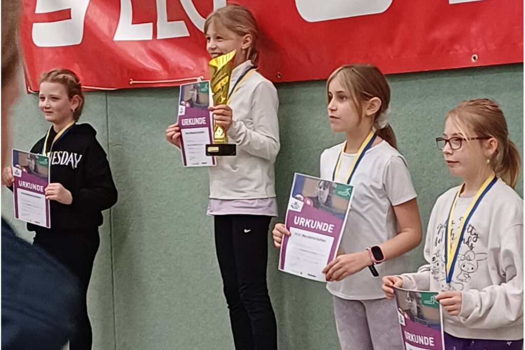 43 Kinder aus den dritten und vierten Klassen unserer Schule nahmen am Wettbewerb „Känguru der Mathematik 2024“ teil. In 75 Minuten versuchten sie, die 24 Knobelaufgaben zu lösen. Nun bekamen alle Teilnehmer eine Urkunde und ein kleines Knobelspiel überreicht. Romir aus der Klasse 3B hat bei dem Wettbewerb den weitesten Känguru-Sprung an unserer Schule geschafft, denn er hat 12 Aufgaben hintereinander richtig gelöst. Dafür bekam er ein T-Shirt geschenkt. Romir hat außerdem mit 83,75 erreichten Punkten deutschlandweit einen 2. Platz bei den Drittklässlern belegt! Dafür bekam er das Knobelspiel „Inselflucht“ als Sonderpreis überreicht.